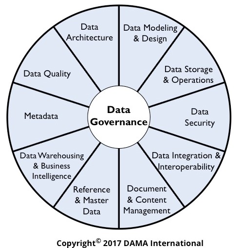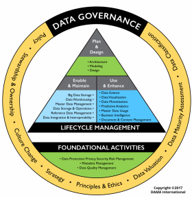 DMBOK2の第一章には、いくつかのデータマネジメント・フレークワークが紹介されています。その代表格は右図の「DAMAホイール図」でしょう。