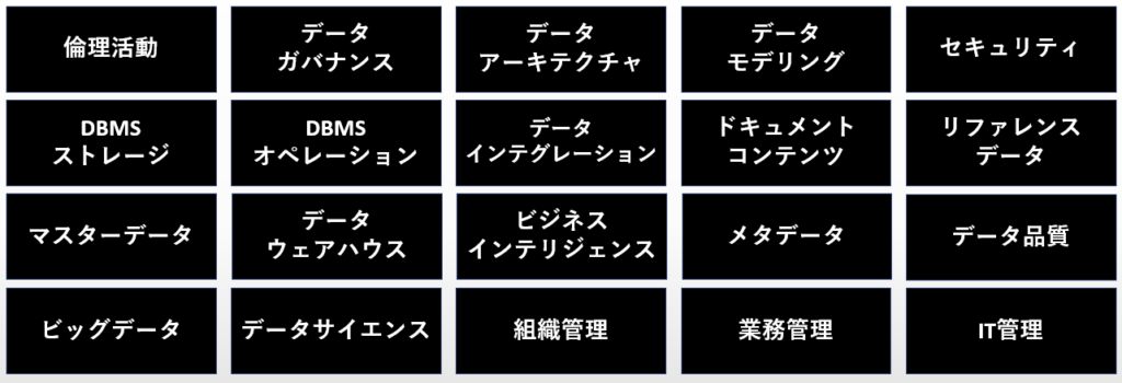 次にデータマネジメントに関連する構成要素を洗い出してみました。これはDMBOKの知識領域も参考にしています。