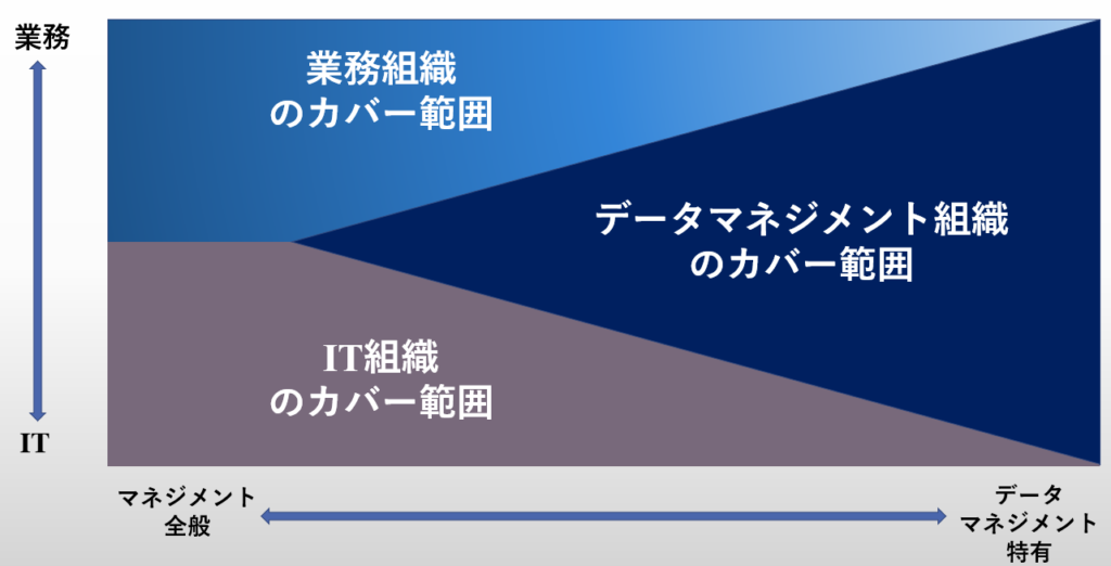 右図の「各組織のカバー範囲」に示すように、データマネジメント組織がカバーすべき範囲は、業務よりのものからITよりのものまであると考えられます。